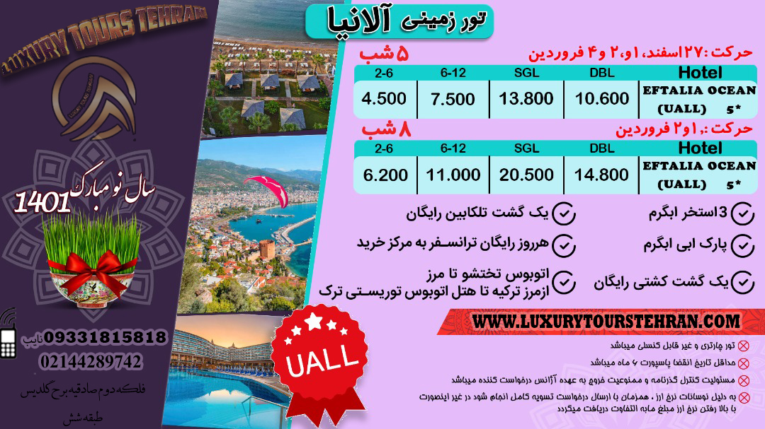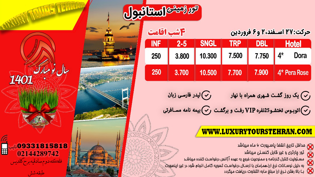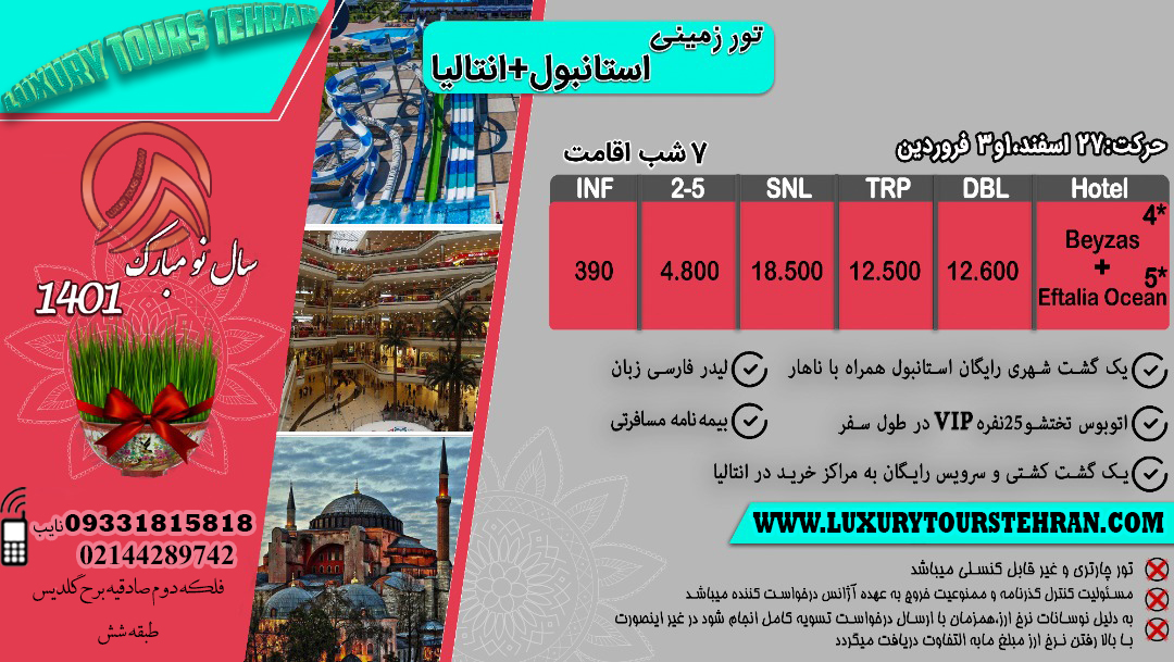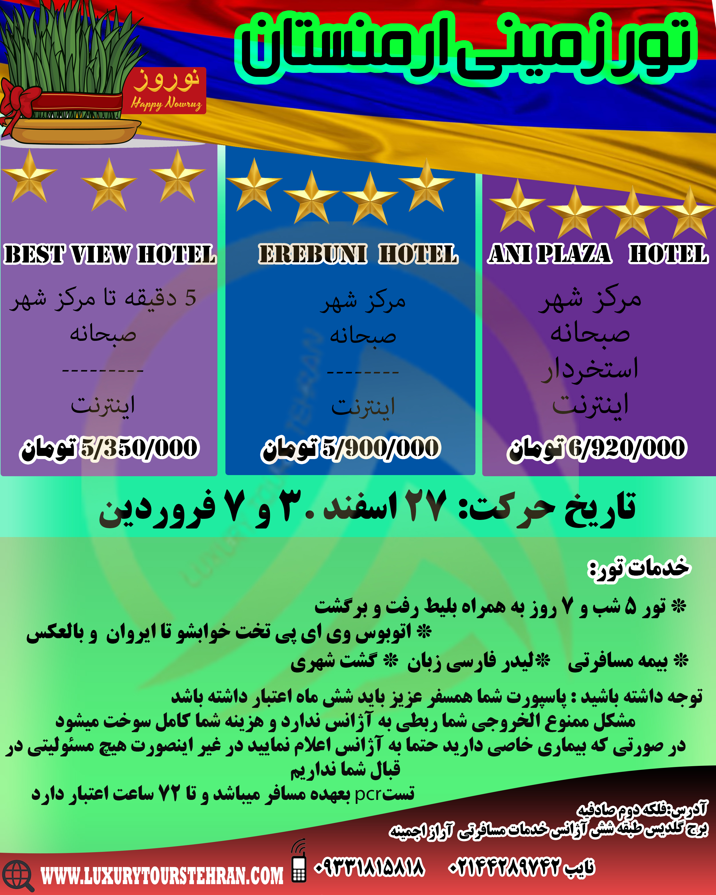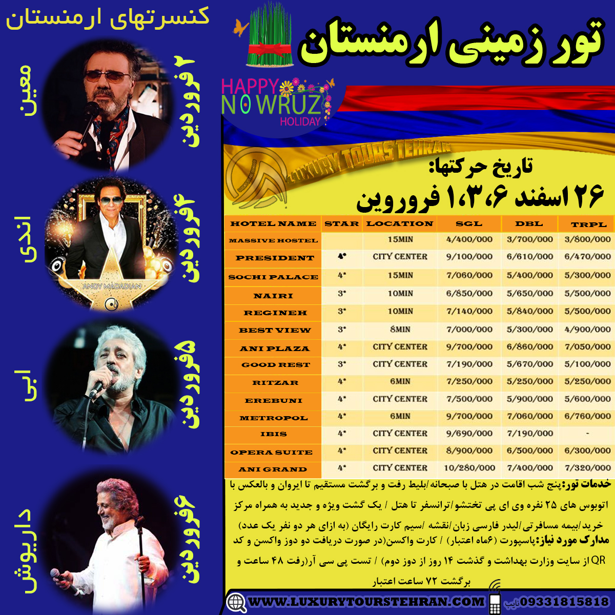 مجری تورهای داخلی و خارجی (زمینی و هوایی) تورهای شاد داخلی: کویرمصر کویر مرنجاب کویر ورزنه کویر کاراکال کویر عشق اباد طبس ماسال ماسوله سرعین اردبیل و۰۰۰۰۰ تورهای زمینی خارجی : وان ترکیه ارمنستان باکو